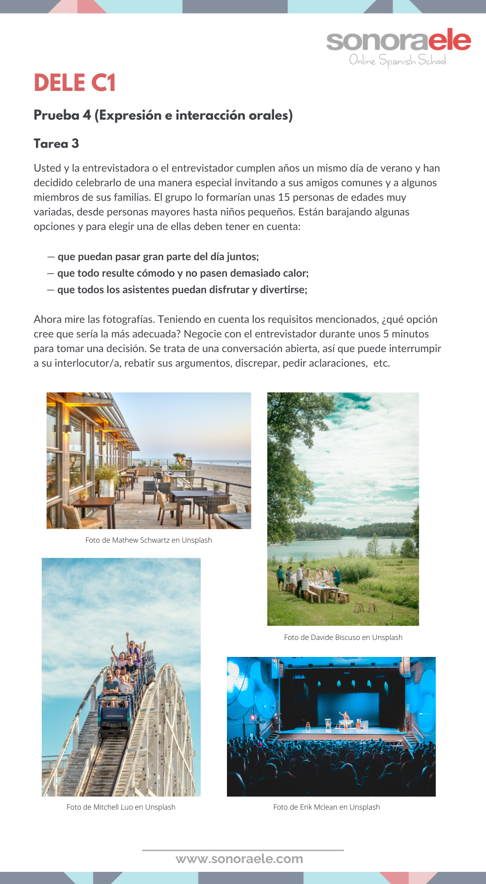 Si estás preparando el DELE C1, sabrás que la tercera tarea de la prueba oral consiste en mantener una conversación espontánea con el entrevistador a partir de una lámina con varias opciones respecto a un mismo tema. El objetivo de la tarea es negociar y llegar a un acuerdo para elegir una de las opciones, así que se evaluará tu capacidad para intercambiar ideas, expresar y argumentar tus opiniones. Para llegar al objetivo, dispondrás de las indicaciones sobre el asunto y su contexto, así como ciertos criterios a tener en cuenta. Esta es la única tarea de la prueba oral que será improvisada; tras las tareas anteriores, el entrevistador te mostrará dos láminas para que elijas una de ellas. La duración de la tarea será de entre 4 y 6 minutos.