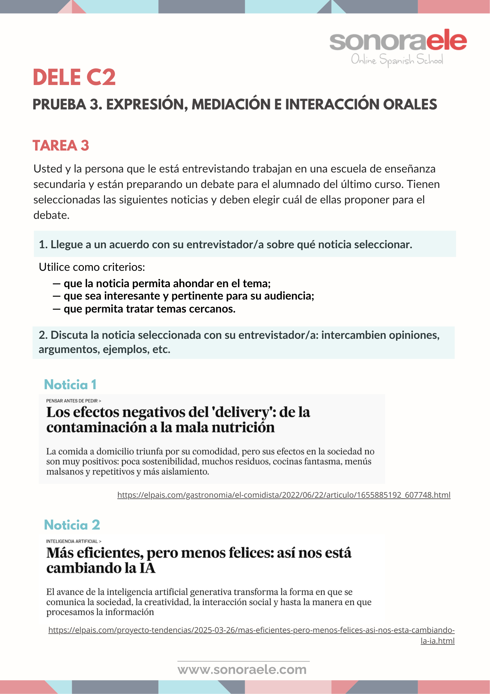 DELE C2. Modelo de tarea 3 de expresión oral. Titulares sobre IA y sobre comida a domicilio. Español.