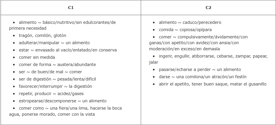 Si estáis preparando el DELE con tiempo, puede ser buena idea ir revisando el vocabulario, las colocaciones o combinaciones frecuentes y las expresiones coloquiales que el Instituto Cervantes clasifica como de nivel C2 en su Plan Curricular. En relación con el primero de los temas de nuestro modelo de hoy, tenéis el punto 5 del inventario de nociones específicas sobre alimentación, que incluye siete pequeños subtemas como este primero: