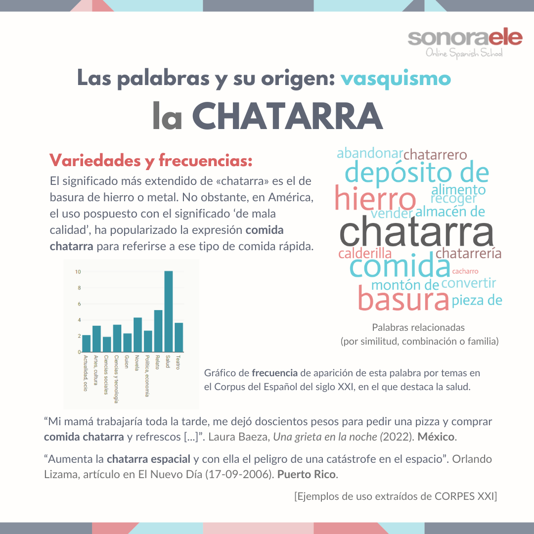 Con ese significado original, tan concreto, probablemente no sea una palabra que hayáis escuchado mucho. Sin embargo, si estáis familiarizados con variantes del español de América, quizá sí conozcáis la expresión “comida chatarra”, muy usada en la mayor parte de los países del continente. En España no es tan popular con ese sentido, donde es más común usar la combinación “comida basura”.