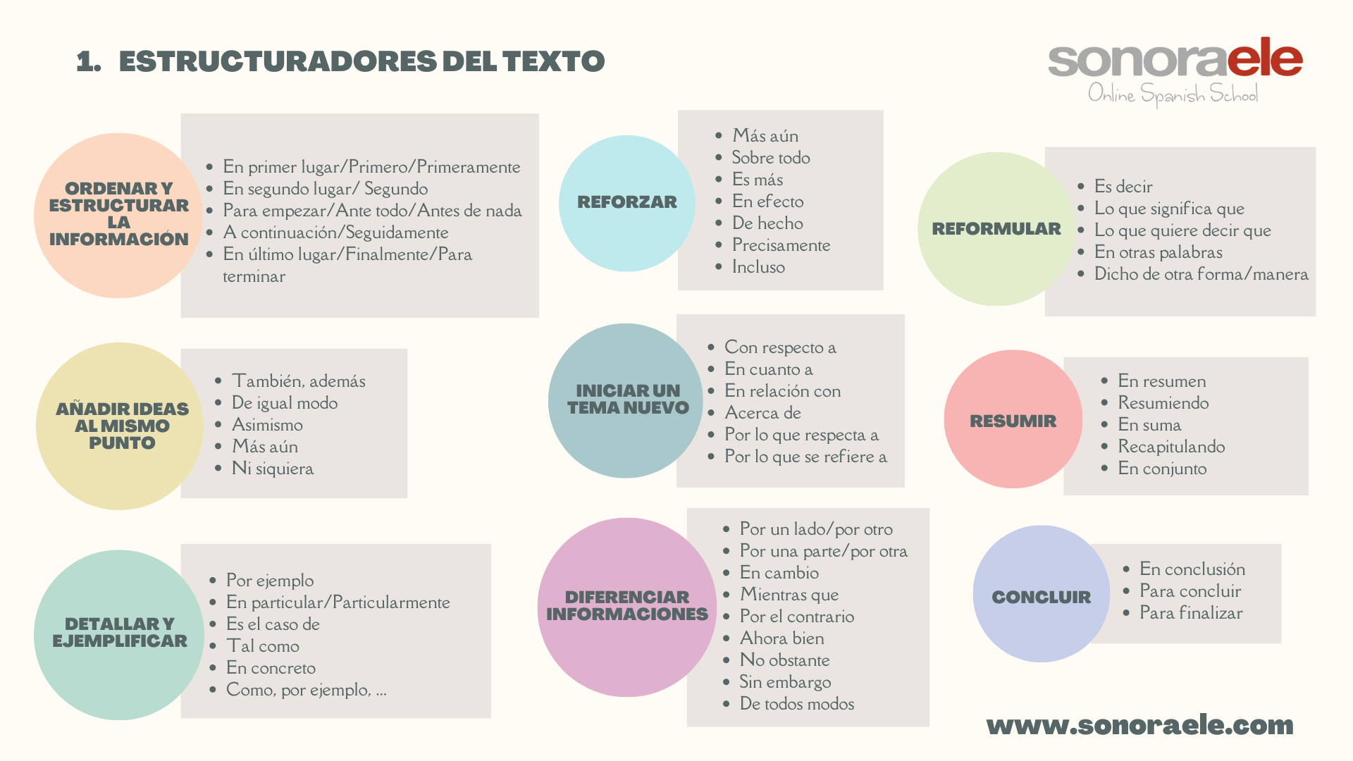 En la expresión oral y escrita es fundamental la cohesión del discurso, conectar y organizar adecuadamente las ideas, para facilitar su comprensión. Y uno de los recursos para ello son los marcadores y conectores textuales, tanto los que estructuran el texto y sus párrafos como los que sirven de nexo entre ideas dentro de las frases.